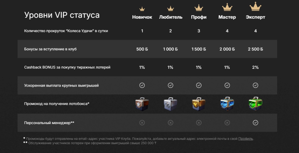 - Cashback BONUS — возврат средств за покупку тиражных лотерей. В зависимости от уровня статуса участники могут получать от 1% до 2% кэшбэка, что делает игру более выгодной.